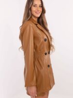 L’élégant blazer en éco-cuir pour femme est une pièce unique de la garde-robe qui allie classicisme et modernité. Fabriqué à partir d’un mélange durable de polyester et de polyuréthane, il est extrêmement élégant tout en étant pratique et facile à entretenir. Grâce à la doublure, il offre un confort lors des journées plus froides, ce qui en fait le choix idéal pour l’automne, l’hiver et le printemps. Le blazer de longueur standard se distingue par ses larges revers, qui apportent une touche chic et intemporelle, et ses épaulettes cousues qui accentuent la silhouette pour un look structuré. La fermeture boutonnée à double boutonnage renforce le caractère élégant de ce modèle, tandis que les plis décoratifs au niveau de la taille affinent optiquement la silhouette, donnant à la veste une expression féminine. C’est le choix idéal pour une variété d’occasions, du style de tous les jours aux réunions formelles ou aux journées de travail. La veste se marie aussi bien avec des pantalons élégants qu’avec des jeans, ce qui permet de créer une variété d’ensembles élégants.