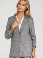 Une veste de tailleur élégante pour femme, de coupe régulière et décontractée, fabriquée dans un tissu à la texture chinée et à la couleur irrégulière qui lui confère un caractère moderne. Le modèle est doté de revers en pointe et de manches 3/4 avec de délicates plis, ce qui ajoute légèreté et élégance à l’ensemble. La veste se ferme par un seul bouton, et à l’avant se trouvent des poches factices. Les épaulettes soulignent subtilement la ligne de la silhouette, et la doublure complète assure un confort de port et une finition élégante. Parfaite aussi bien pour des tenues décontractées que plus formelles.