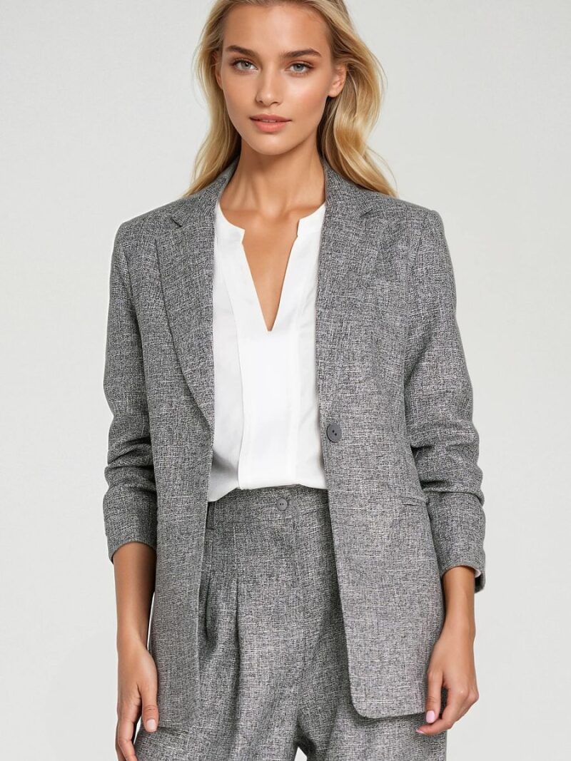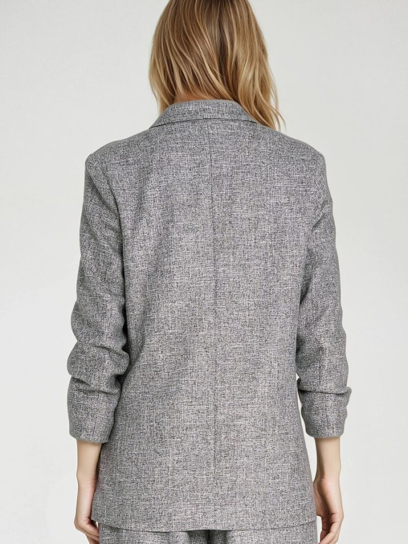 Une veste de tailleur รฉlรฉgante pour femme, de coupe rรฉguliรจre et dรฉcontractรฉe, fabriquรฉe dans un tissu ร la texture chinรฉe et ร la couleur irrรฉguliรจre qui lui confรจre un caractรจre moderne. Le modรจle est dotรฉ de revers en pointe et de manches 3/4 avec de dรฉlicates plis, ce qui ajoute lรฉgรจretรฉ et รฉlรฉgance ร l’ensemble. La veste se ferme par un seul bouton, et ร l’avant se trouvent des poches factices. Les รฉpaulettes soulignent subtilement la ligne de la silhouette, et la doublure complรจte assure un confort de port et une finition รฉlรฉgante. Parfaite aussi bien pour des tenues dรฉcontractรฉes que plus formelles.