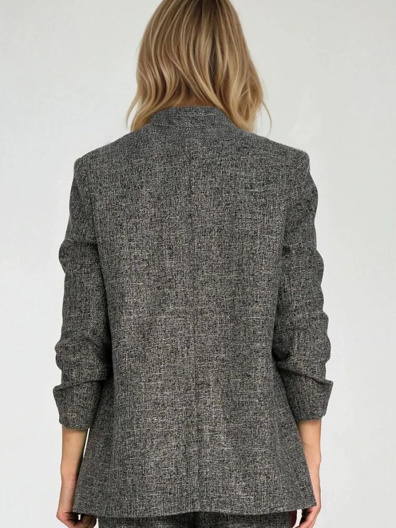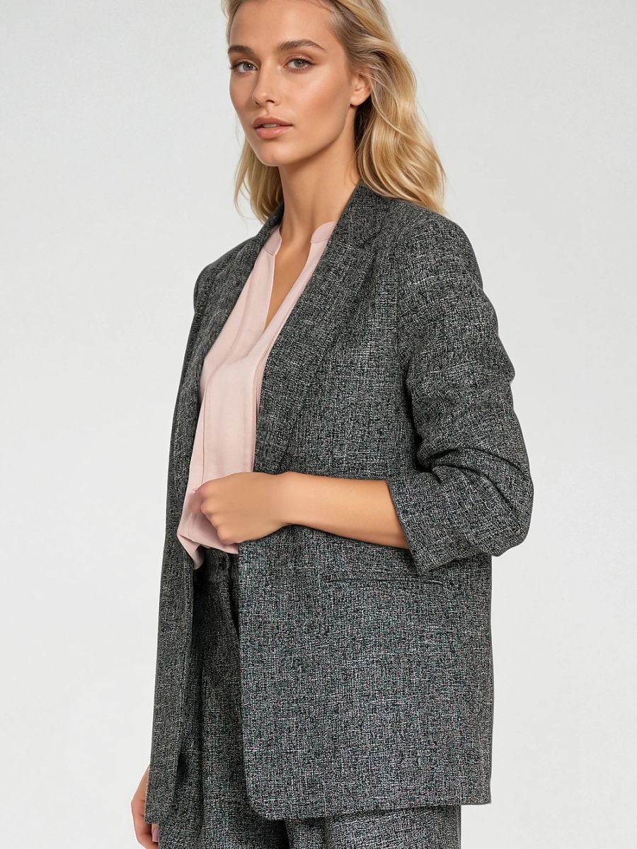 Une veste élégante pour femme de coupe régulière, ample, fabriquée dans un matériau à la texture chinée et à la couleur irrégulière, ce qui lui confère un caractère moderne. Le modèle a des revers et des manches 3/4 avec de délicats plis, ce qui ajoute légèreté et élégance à l’ensemble. La veste se ferme par un bouton et comporte des fausses poches à l’avant. Les épaulettes soulignent subtilement la silhouette, tandis que la doublure complète assure un confort de port et une finition élégante. Parfait pour des tenues décontractées ou plus formelles.